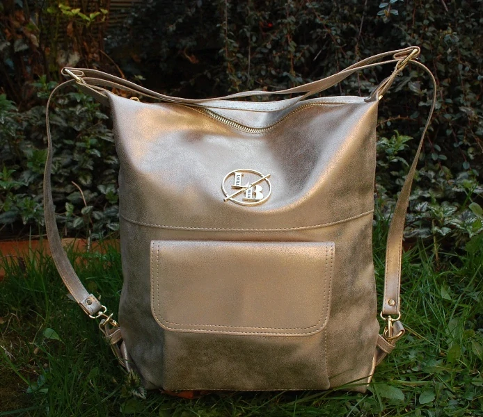 Zlatá zlatistá výrazná kabelka/ batoh s vreckom vpredu.