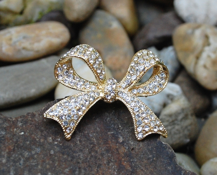 Zlatá štýlová brošňa v tvare mašle, brúsené sklo striebornej farby :)