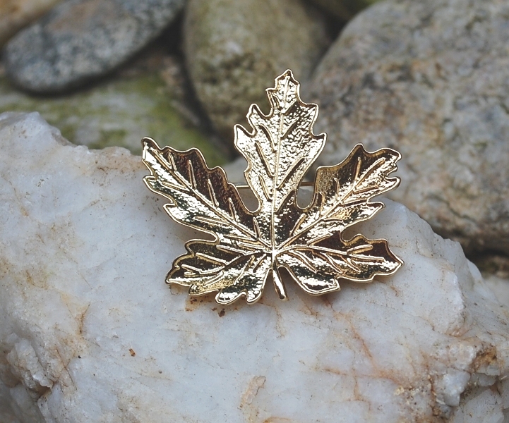 Nádherný jednoduchý list, žiarivá brošňa zlatej farby s leskom.