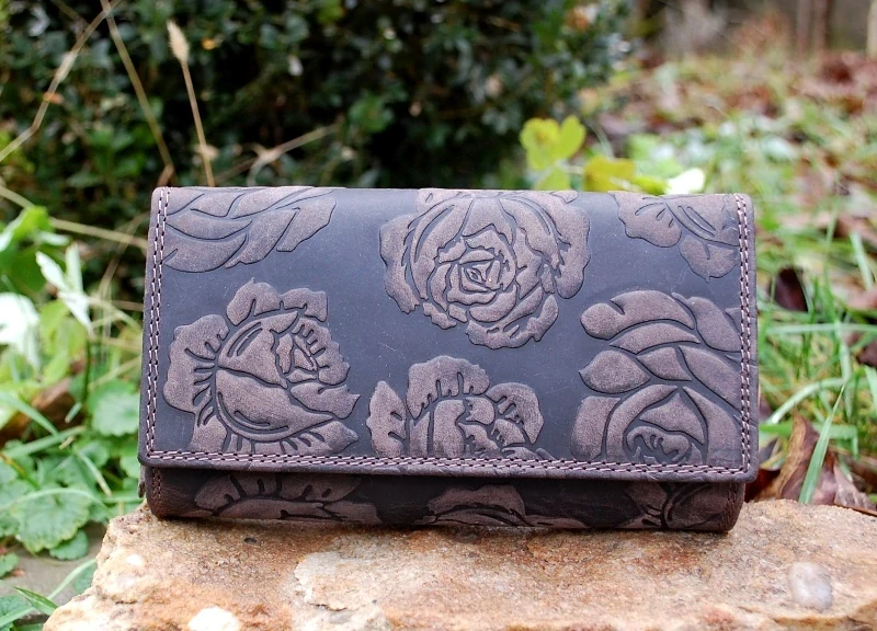 - Dámska hnedá kožená peňaženka s kvetmi oddelenie na karty