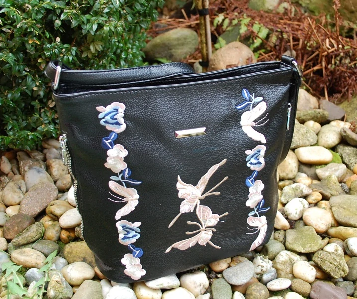 Čierna crossbody kabelka s vyšívanými kvetmi.