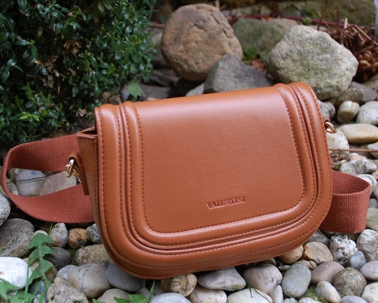 Hnedá koňaková výrazná kabelka s preklopkou a logom VALENTINI.