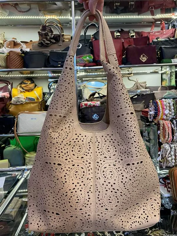 Krémová perforovaná kabelka so strieborným kovaním a malou taškou.