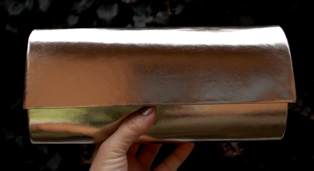 Kabelka krásnej zlatej farby so zrkadlovým efektom, pevný vystužený tvar, ekokoža lakovaná s leskom.