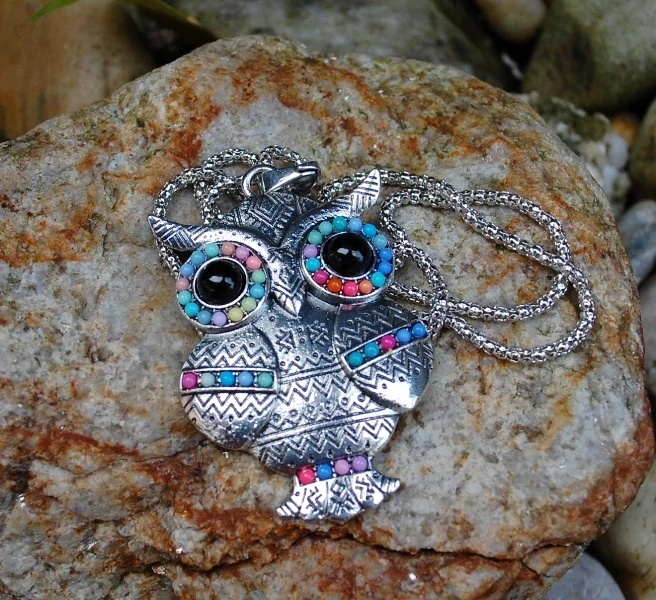 Nádherná veľká sova vykladaná farebnými kamienkami na striebornej retiazke, vyzerá ako starožitnosť :)