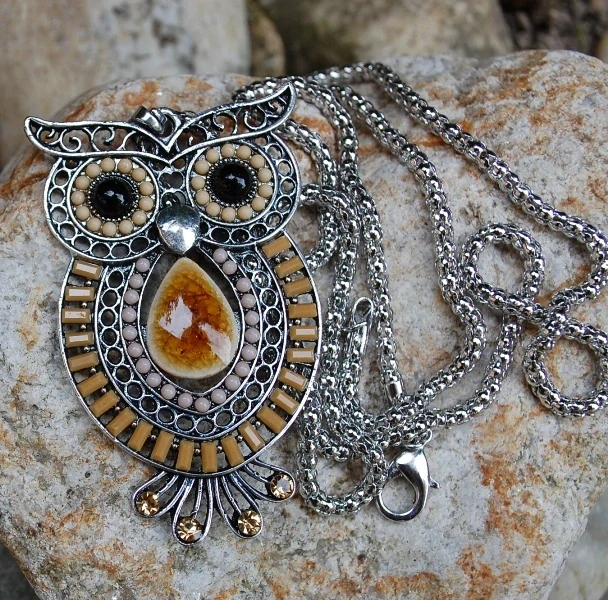 Nádherná veľká sova vykladaná krémovými a smotanovými kamienkami na striebornej retiazke, vyzerá ako starožitnosť :)