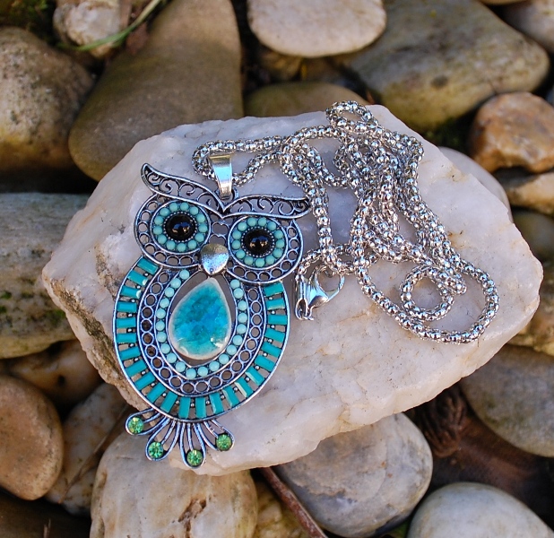 Nádherná veľká sova vykladaná mentolovými kamienkami na striebornej retiazke, vyzerá ako starožitnosť :)