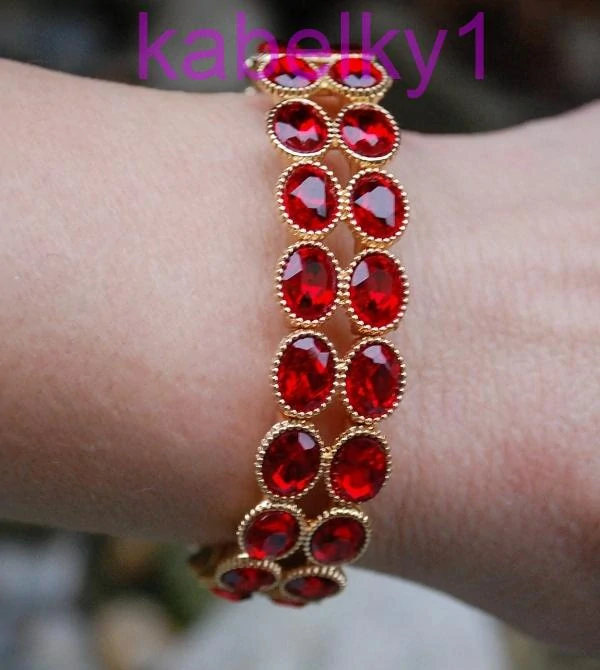 Červený náramok ozdobený brúseným sklom, zlatý podklad.