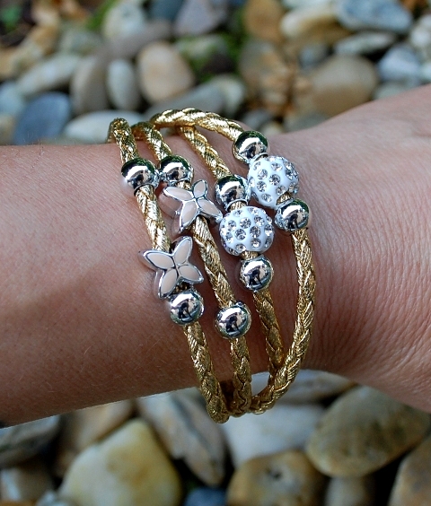 Náramok z pletenej šnúrky zlatej farby, štyri rady, ozdobený srdiečkami, striebornými guličkami a bielymi ozdobami s brúsenými kamienkami :)