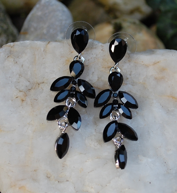 Čierne náušnice z brúseného skla na striebornom podklade.