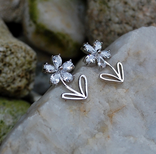 Náušnice v tvare kvetu, napichovačky, strieborná farba, ozdobené brúseným sklom :)