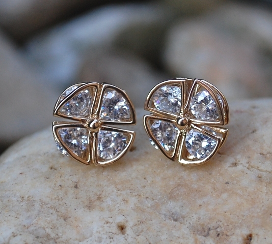 Krásne náušnice napichovačky, zlatý podklad zdobený brúseným sklom, priemer 1,4 cm, hrúbka 0,5cm, vhodné na každý deň :)