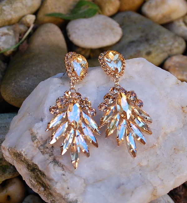 Zlaté luxusné štrasové spoločenské náušnice z brúseného skla na zlatom podklade.