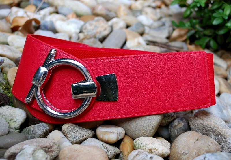 Štýlový, červený, výrazný opasok, pružný, pracka strieborná zrkadlová.