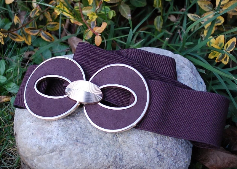 Štýlový, hnedý opasok so zlatou prackou a hnedým semišom.