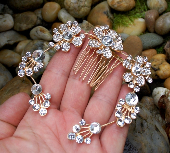 Ozdoba zlatej farby zdobená strieborným brúseným sklom, vhodná na každú spoločenskú akciu, do každého účesu.