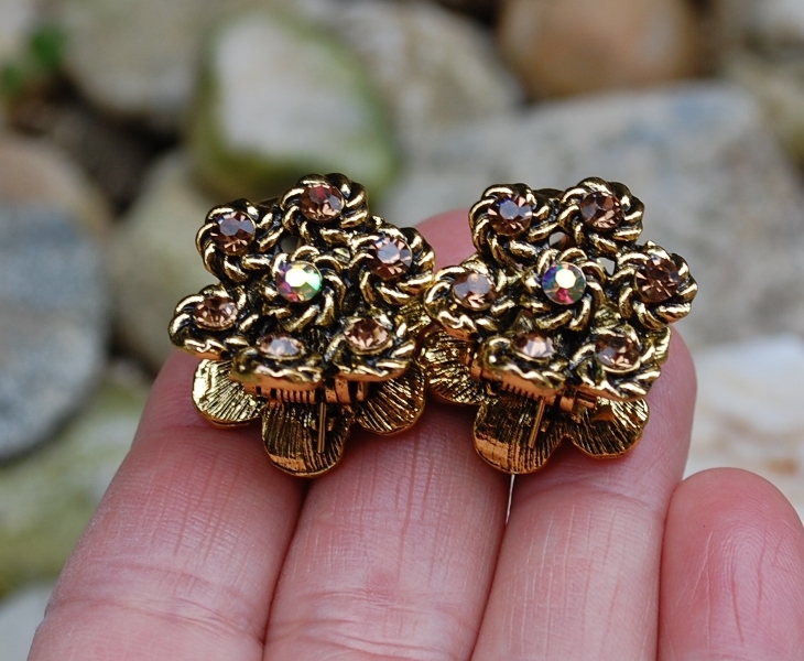 Zlaté tmavé štipce ozdobené v strede brúseným sklom menacim farby do dúhova.
