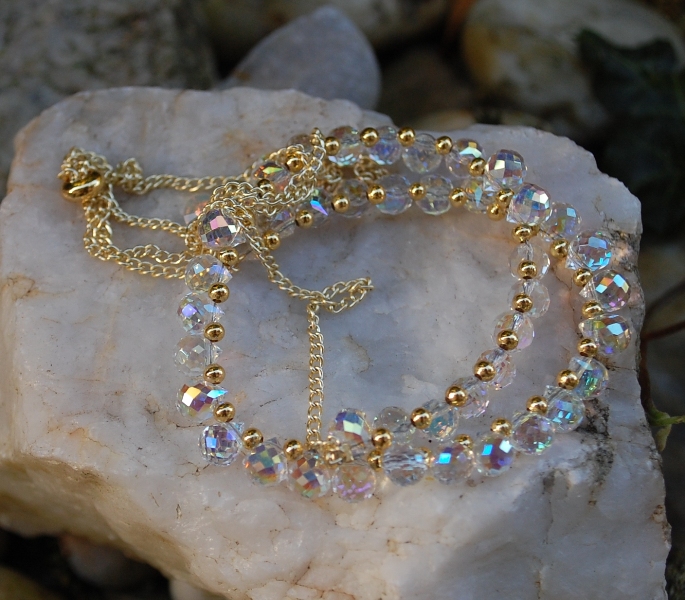 Náhrdelník z brúseného skla, dúhové odlesky a zlaté guličky.