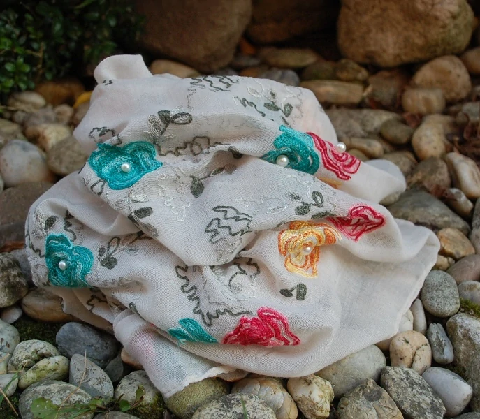 Šál smotanový s perličkami mint mentol ružová červená zelená kvety vyšívkaSkladom12,00 EUR/ ks